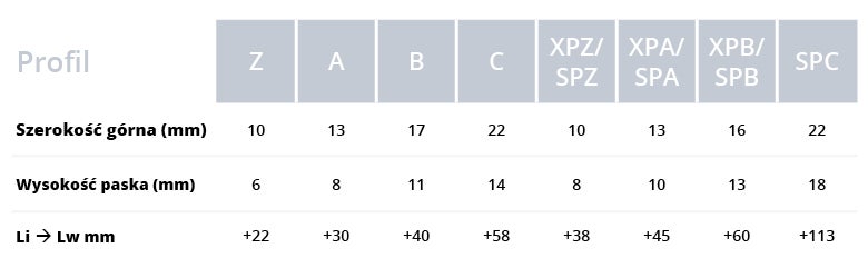 Aby pokazać różne rozmiary i różnice pomiędzy wewnętrzną, roboczą i zewnętrzną długością różnych pasków klinowych, przygotowaliśmy specjalną tabelę.