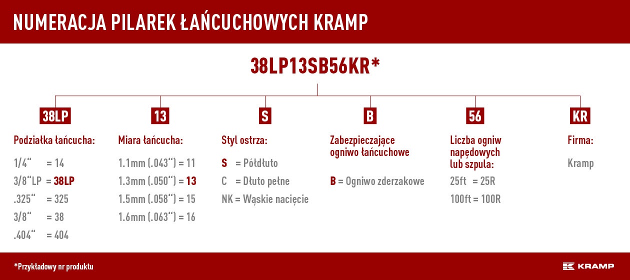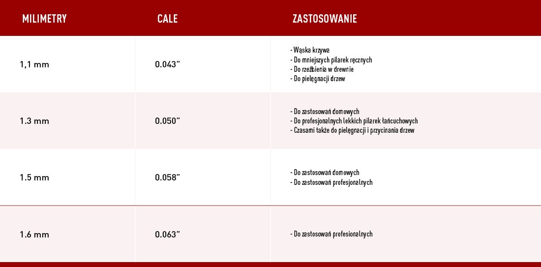 Skorzystaj z poniższego wykresu jako przewodnika, aby znaleźć odpowiedni łańcuch do swojej pilarki.