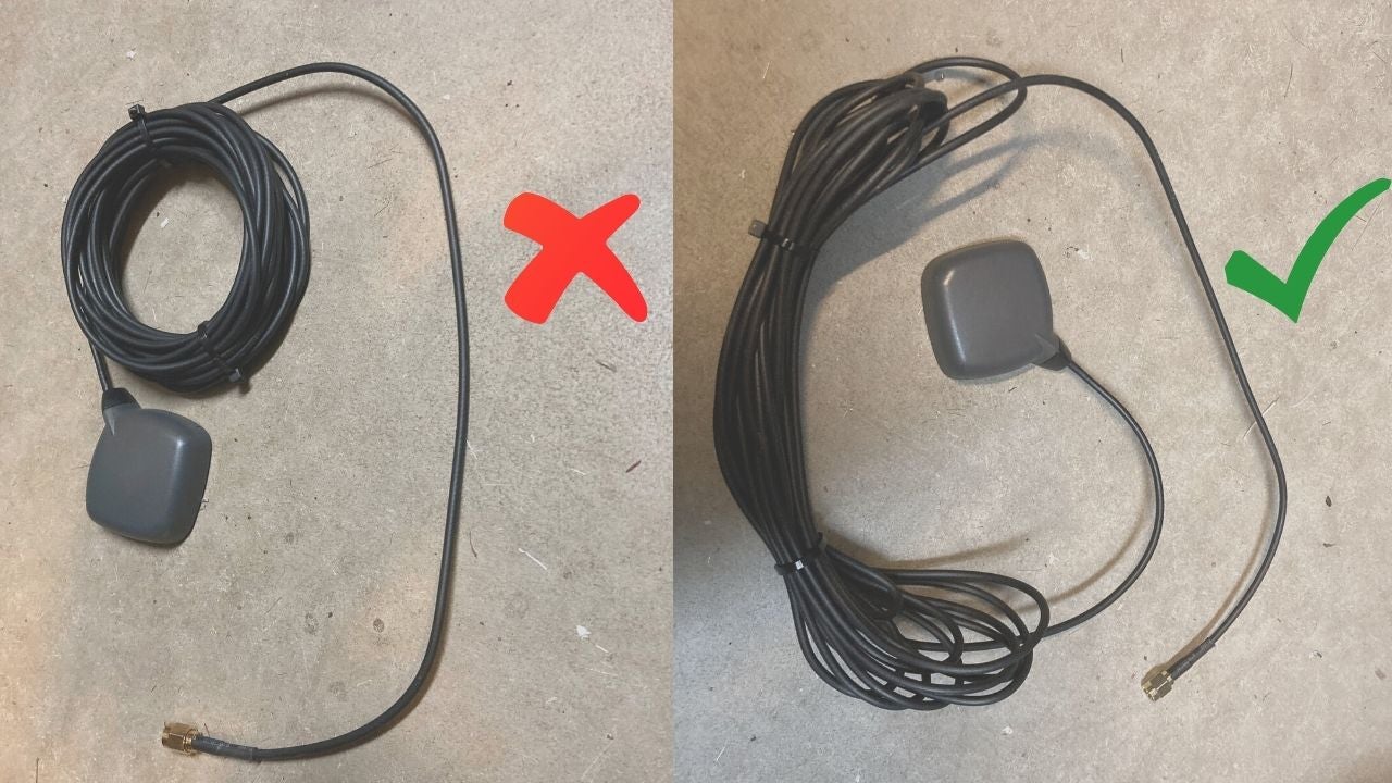 W przeszłości spotykaliśmy się z sytuacją, gdzie w systemie nawigacji GPS CL220 zgrabnie zwinięty kabel przejął funkcję anteny od faktycznej anteny GPS. Układanie kabla na krzyż zapobiega temu problemowi i/lub natychmiast go rozwiązuje.