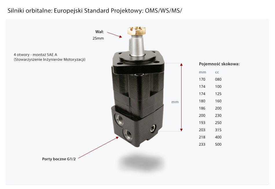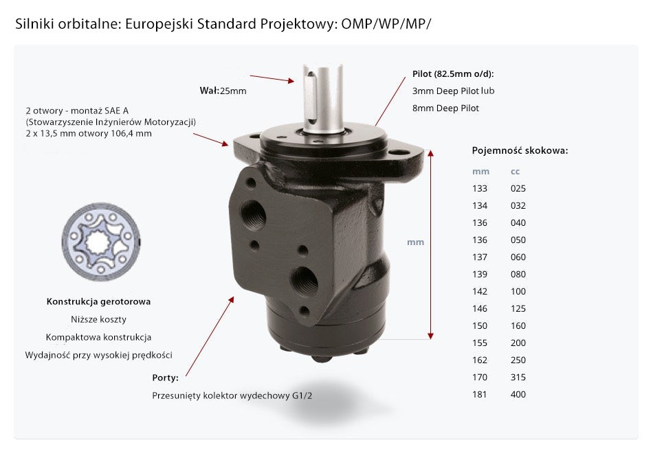 Przyjrzyjmy się najpierw odmiennemu silnikowi orbitalnemu, ponieważ jego identyfikacja jest prosta. Jeśli na silniku nadal znajduje się etykieta, można z niej odczytać kod produktu lub nazwę kończącą się na „S”. Tak powinno być niezależnie od producenta. Ten rodzaj silnika można znaleźć w solidnych, wytrzymałych maszynach zaprojektowanych do ciężkich zadań, w których występują wysokie obciążenia, takich jak napędzanie osi i kół. Jest on błyskawicznie rozpoznawalny dzięki swojemu kształtowi i bocznym portom na przeciwległym końcu wału. Rozmiar modelu zamiennika można ustalić na podstawie pojemności skokowej.