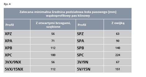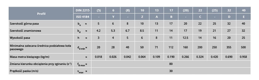 Z pomocą poniższej ilustracji i tabeli znajdziesz odpowiedni wąskoprofilowy pas klinowy. Poszczególne rodzaje przekrojów poprzecznych różnią się w zależności od szerokości górnej i wysokości pasa.
