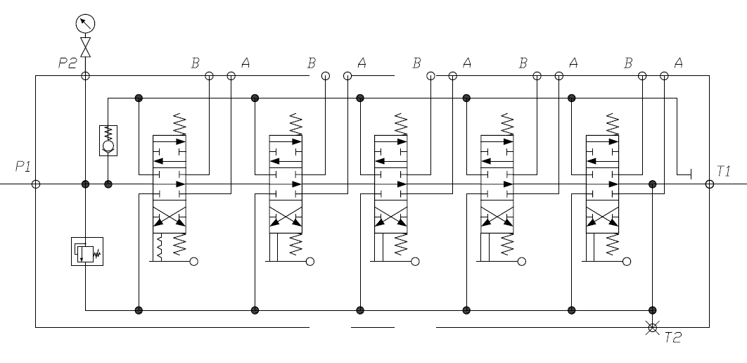 Każdy zawór sterujący posiada swój unikalny schemat, który opisuje zasadę jego działania. Schematy te są nieodzownym elementem, umożliwiającym zrozumienie, jak dany zawór funkcjonuje w określonym układzie hydraulicznym. „Ze schematów hydraulicznych odczytujemy pełną specyfikacje zaworu. Na podstawie schematu możemy określić ilu sekcyjny jest dany zawór startujący, jakie funkcje w układzie pełnią poszczególne sekcje, jak są sterowane i pozycjonowane oraz czy w układzie wbudowane są dodatkowe zawory np. zwrotne czy przelewowe”, mówi Wojciech Kołodziejczak, specjalista ds. produktów firmy Kramp. Przykładowy schemat hydrauliczny rozdzielacza 4 sekcyjnego sterowanego ręcznie za pomocą dźwigni przedstawia Rys.1.