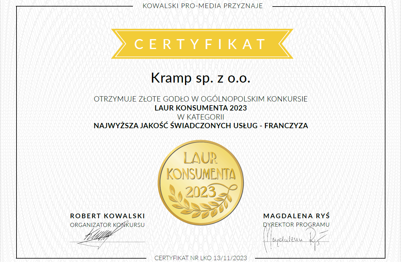Miło nam poinformować, że oferta KRAMP Sp. z o.o. została wyróżniona w ogólnopolskim plebiscycie Laur Konsumenta 2023. Kramp otrzymał złoty Laur Konsumenta za zajęcie pierwszego miejsca w sondażu w kategorii: najwyższa jakość świadczonych usług – franczyza.