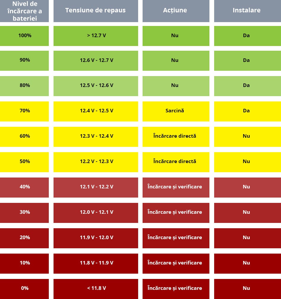 Pentru a vă asigura că bateriile vor funcționa corect atunci când aveți nevoie de ele, este o bună practică să le verificați cu un tester de baterie la fiecare trei luni. Rezultatul este mai mic de 12,5V? În acest caz, este important să o încărcați la maxim. Puteți afla mai multe despre testerele pentru baterii disponibile la Kramp aici. Tabelul de mai jos arată ce să faci cu bateriile din depozitul tău în orice situație dată.