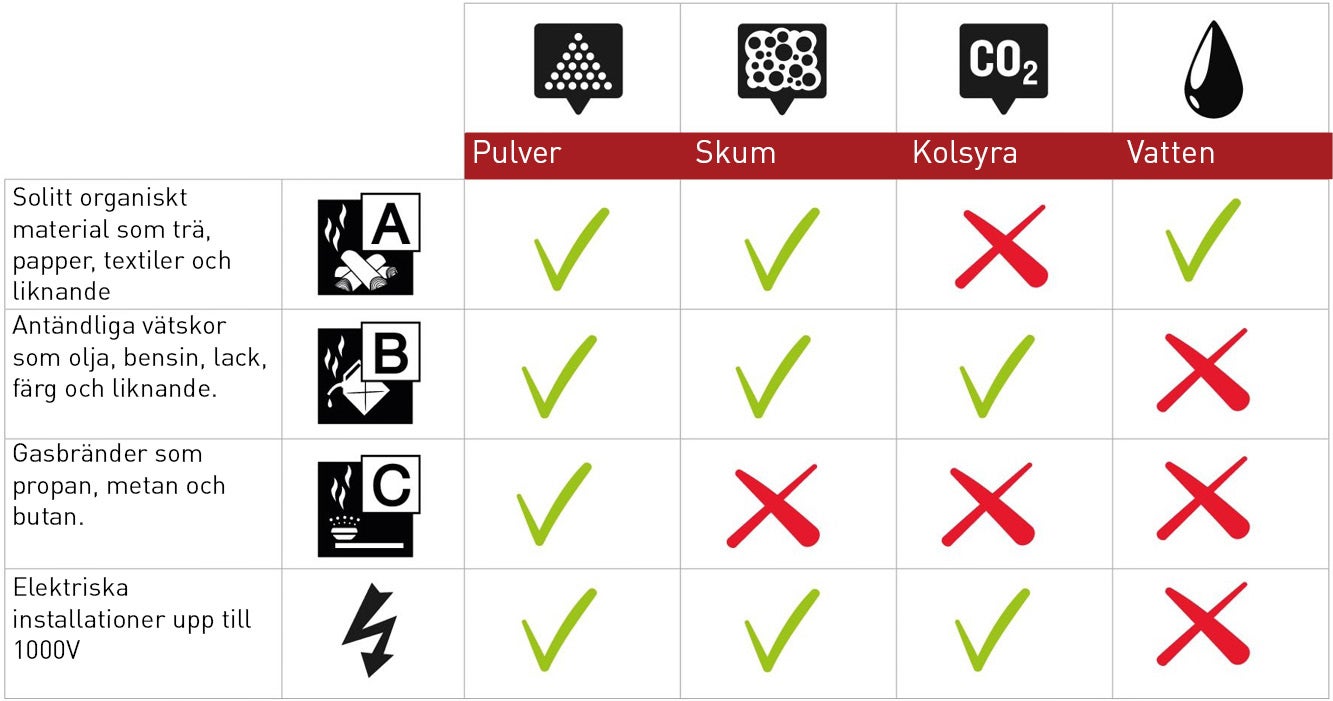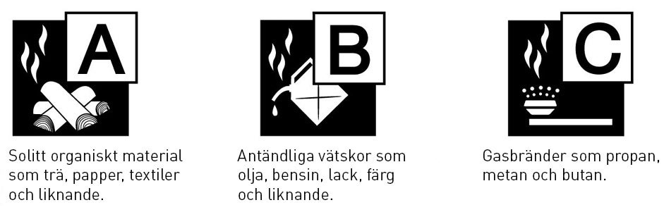 Alla brandsläckare är godkända för användning mot mer än bara en typ av brand, men inte mot alla. Typen av brand indikerar på vilken typ av släckare som bör användas. Var noga med att ha rätt släckare till rätt situation.