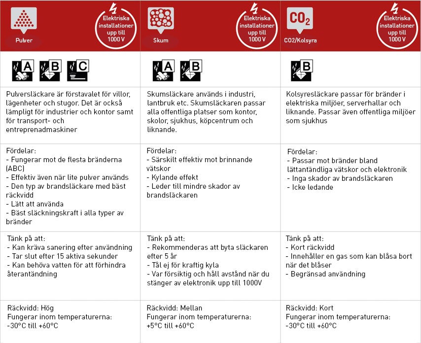 Det finns flera olika typer och storlekar av brandsläckare. De är gjorda för olika situationer och miljöer, och beroende på vilken typ av brand som bryter ut är det viktigt att ha rätt brandsläckare på rätt plats. I bilden nedan kan du se de vanligaste brandsläckarna och vilka fördelar och nackdelar de bär med sig.