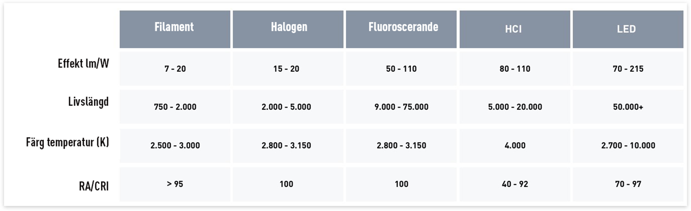 Tabellen nedan visar de viktigaste skillnaderna mellan de olika lamptyperna. Tabellen inkluderar glödlampor, halogenlampor, lysrör, HCI och LED. Vad är skillnaderna när det gäller effektivitet, livslängd, färgtemperatur och CRI/RA-värde?