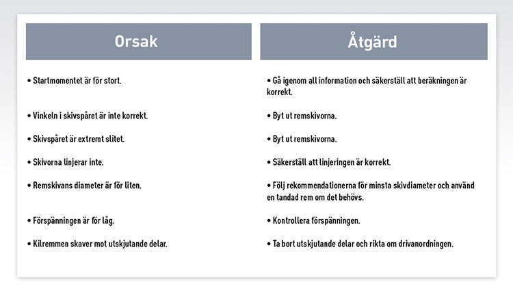 Det finns ett antal orsaker till att extrem förslitning kan uppstå. Kontrollera samtliga orsaker som listas här och byt om nödvändigt till en tandad rem eller rikta drivanordningen på nytt.
