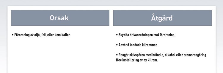 Förorening av olja, fett eller kemikalier kan göra att kilremmen utvidgas eller blir mjuk och kladdig.
