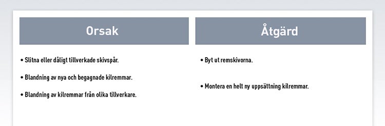 Att kilremmar töjs ojämnt kan bero på slitna eller dåligt tillverkade skivspår, att man blandat nya och begagnade kilremmar på drivanordningen eller att man blandat kilremmar från olika tillverkare. Lösning? Montera alltid en helt ny uppsättning från samma tillverkare och inom samma typnummer. Det hjälper dig att undvika problem!