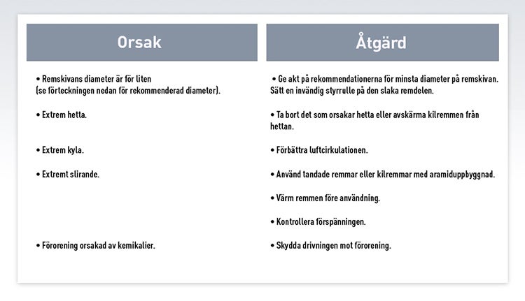 Sprickor uppstår när remskivans diameter är för liten (se förteckningen nedan), remmen har påverkats av kemikalier, eller blivit utsatt för extrem hetta, extrem kyla eller extremt slirande.
