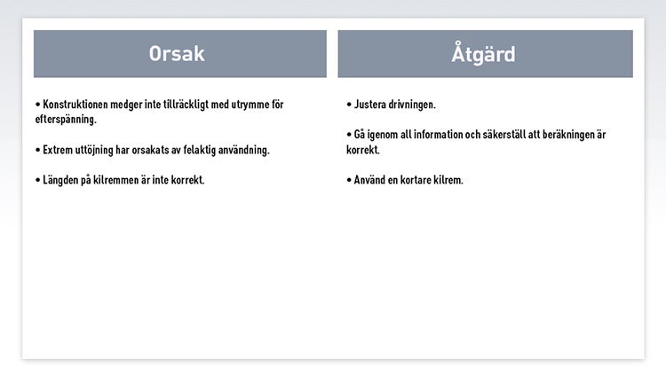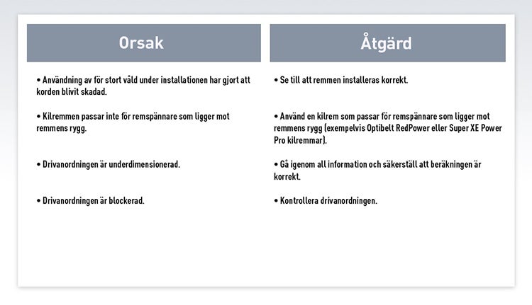 Det kommer inte att vara möjligt att efterspänna remmen om konstruktionen gör att det saknas utrymme, om remmen blivit extremt uttöjd genom felaktig användning, eller om längden inte är korrekt från början. Lösningen? Hitta var felet ligger, fastställ den korrekta längden för kilremmen och byt ut den om det behövs.