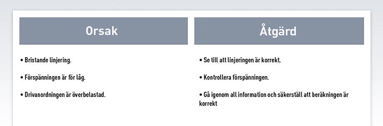 Ett vanligt problem är onormalt eller extremt högt driftsljud. Vilken expert som helst kan tala om för dig att det här kan bero på bristande linjering, för låg förspänning eller en överbelastad drivanordning. Gå igenom information och justeringar och försäkra dig om att beräkningen är korrekt. Det här kan du göra själv eller ta hjälp av en expert.
