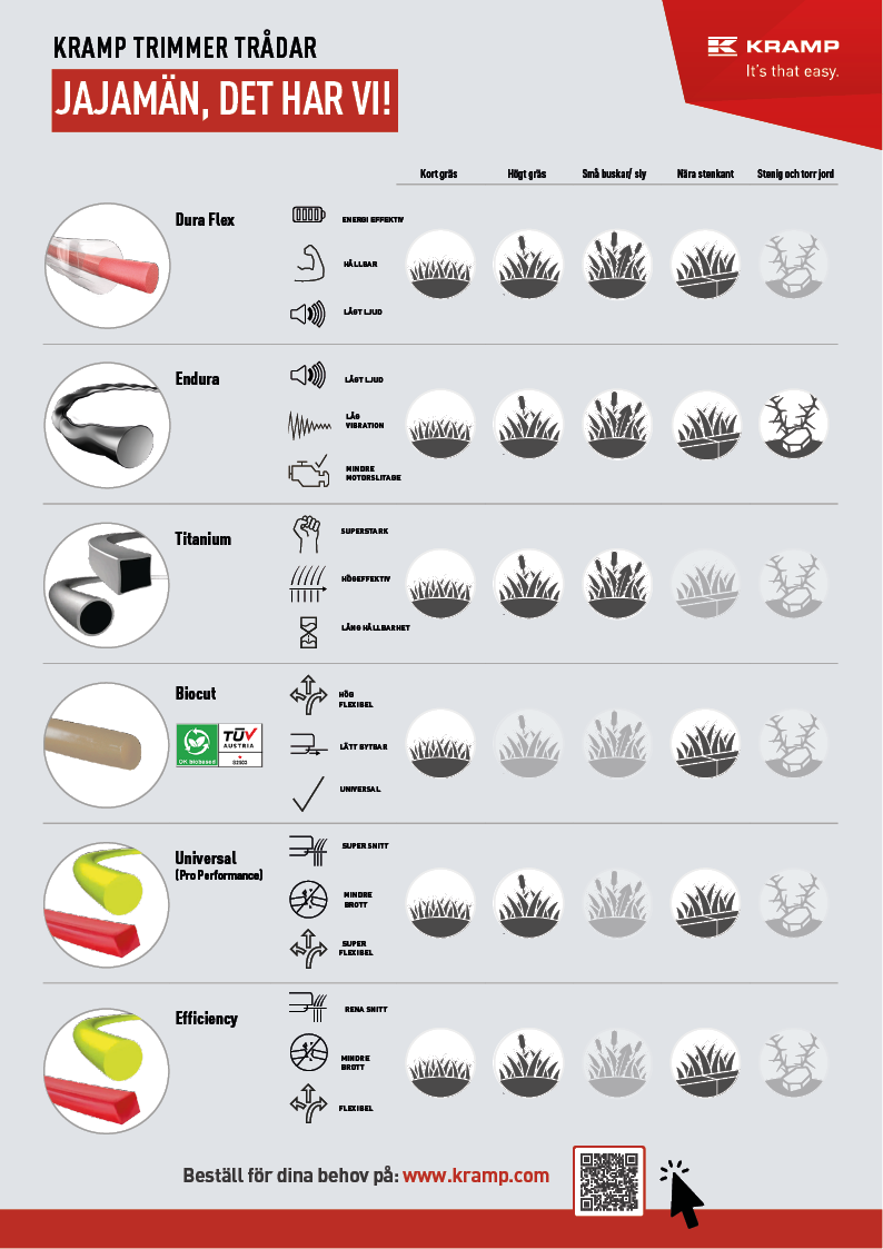 Med Kramps trimmertrådar blir trädgårdsarbetet lätt. Vi erbjuder ett brett sortiment av trimmertrådar, anpassade för olika typer av gräs och växtlighet. Oavsett om du ska trimma tunt gräs, högt ogräs eller tuffare vegetation har Kramp tråden som passar för uppgiften.