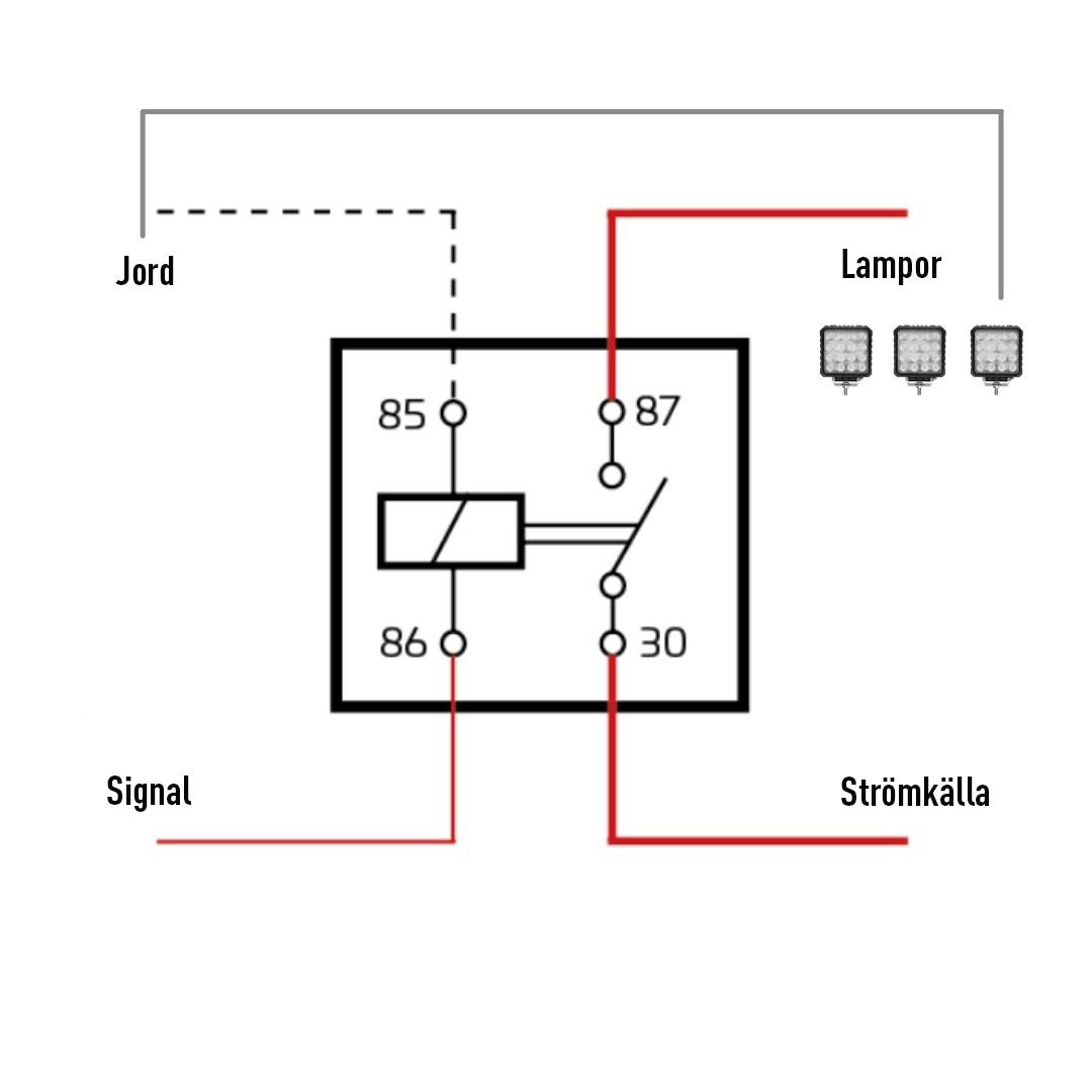 Till exempel: du vill ersätta 4 st 30 Watt Halogen lampor med 4 st 45 Watt och 2 st 60 Watt LED arbetslampor. Detta resulterar: 4x45+2x60=300 Watt (300/12=25A) i den nya situationen jämfört med Halogen lamporna 120W (120/12=10A). Detta verkar inte mycket men det kan få konsekvenser för den ursprungliga ledningen. Det är därför klokt att lägga en extra strömkabel med ett relä till dessa nya lampor. Om det krävs sex meter kabel från källan måste vi använda 3,5 mm² kabel. Naturligtvis måste du också se till att det finns en bra säkring så nära källan som möjligt. Välj en bra säkringsdosa som är resistent mot fukt, olja, damm och vibrationer.