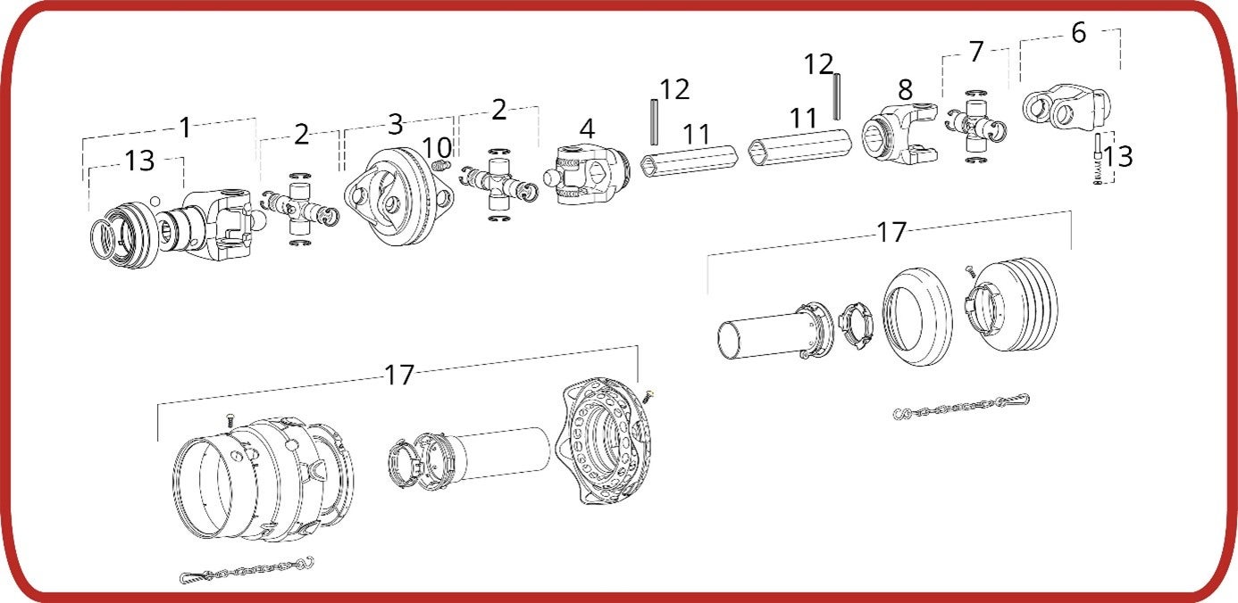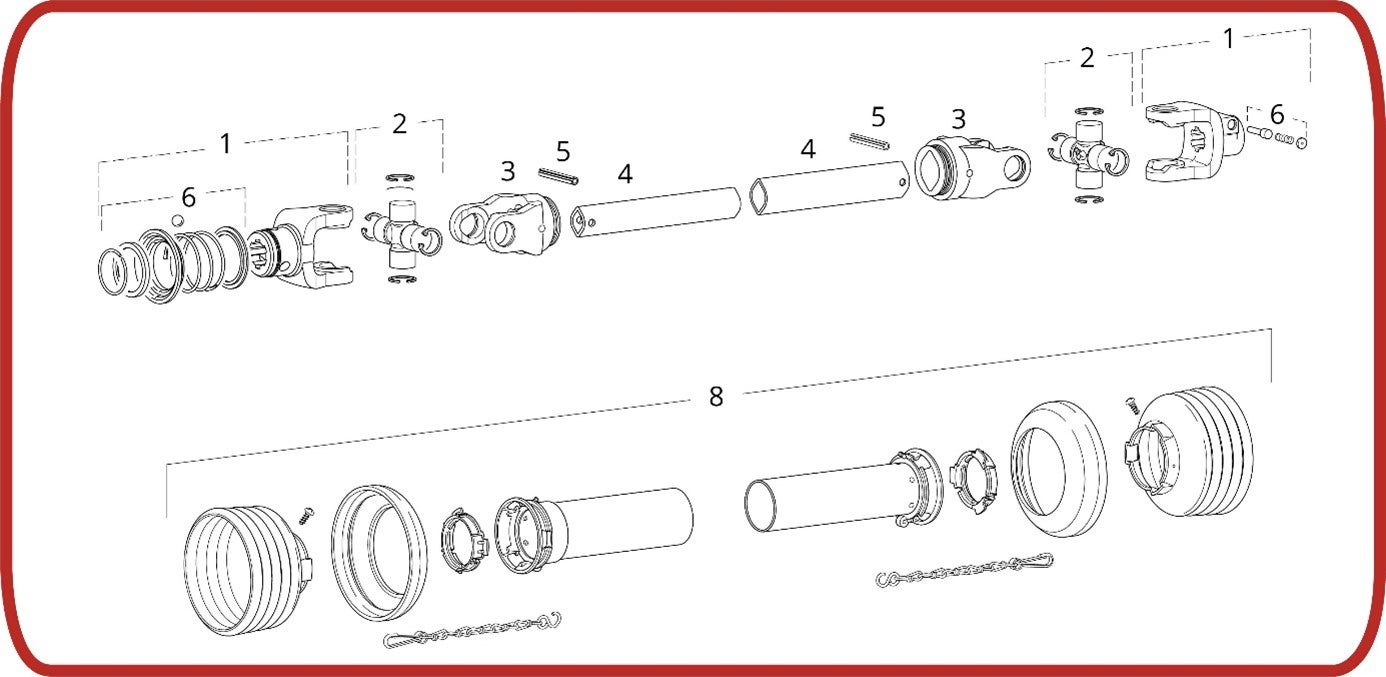 Nedan finns en sprängskiss som visar en kraftuttagsaxel av standardtyp, en kraftuttagsaxel med vid vinkel i ena änden och en kraftuttagsaxel med vid vinkel i båda ändarna. Tillbehör för kraftuttagsaxlar, t.ex. brytbultar eller friktionskopplingar, monteras vanligen på höger sida direkt på knutkorset (nummer 1, vanligen på maskinsidan).