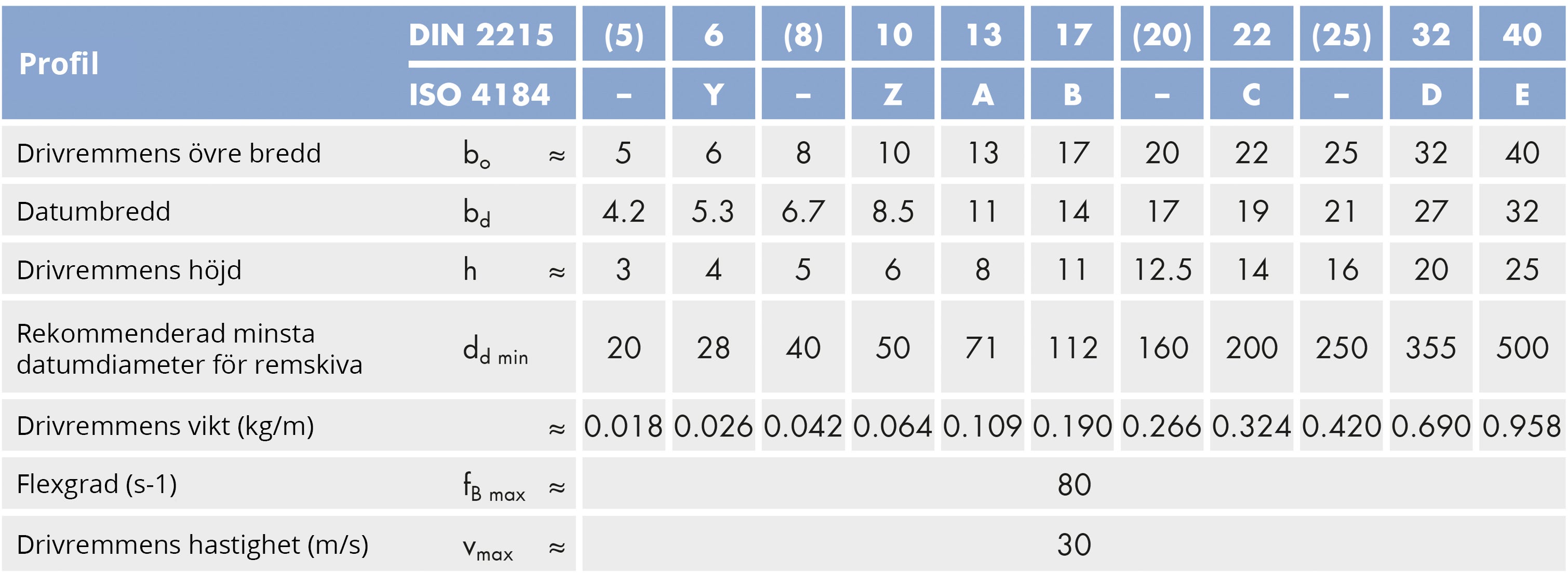 Använd diagrammet och tabellen nedan för att hitta rätt V-drivrem. Måtten som identifierar tvärsnitten är drivremmens övre bredd samt djup.