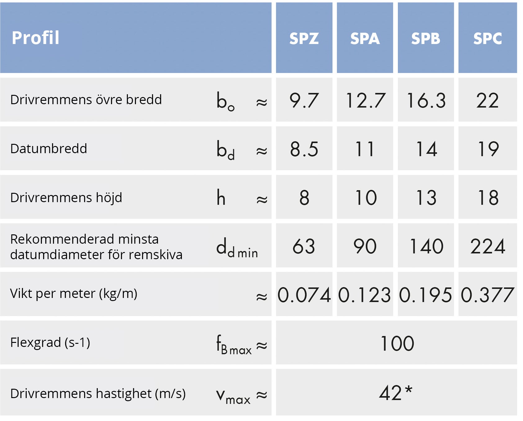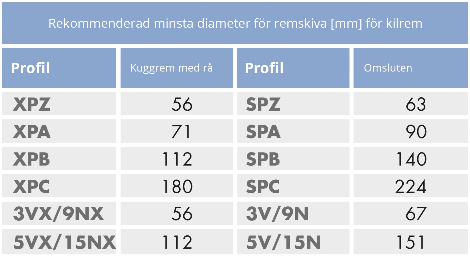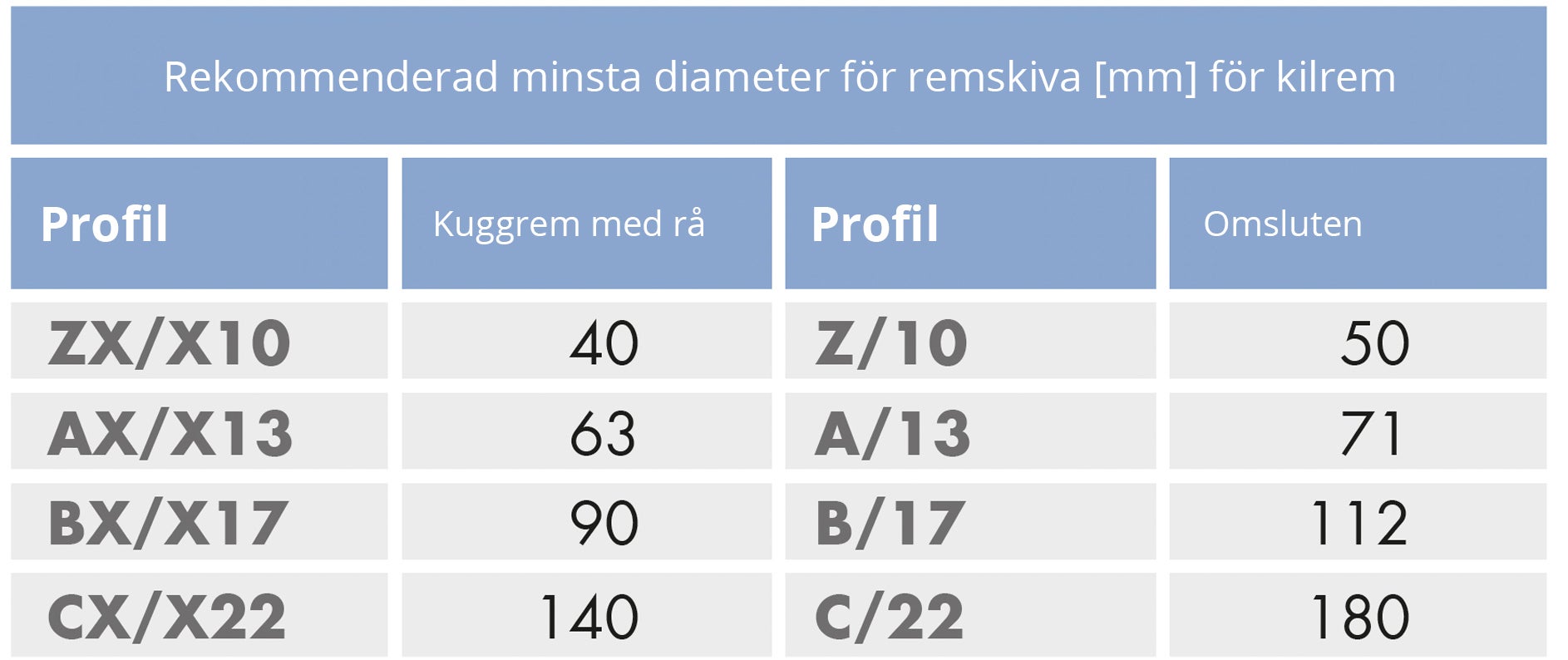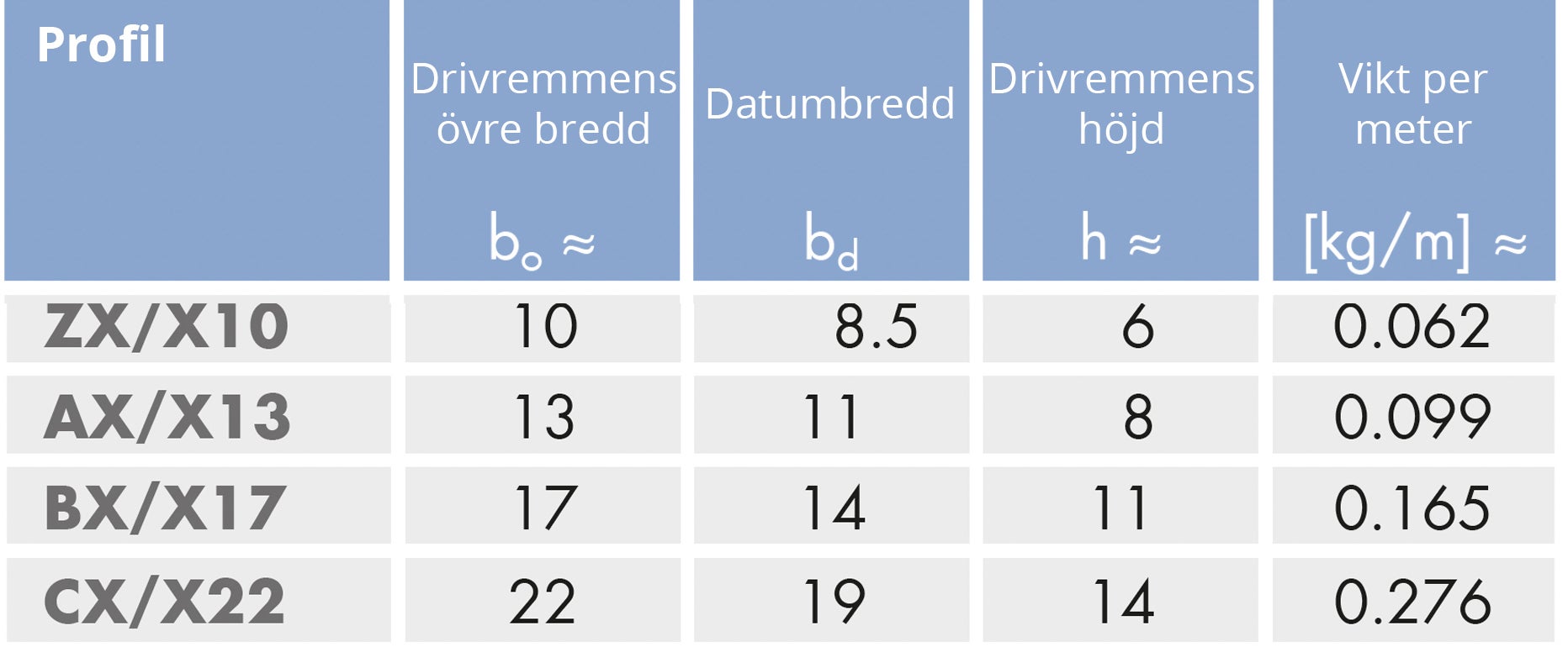 Använd diagrammet och tabellen nedan för att hitta rätt kilrem. Måtten som identifierar tvärsnitten är drivremmens övre bredd samt djup.