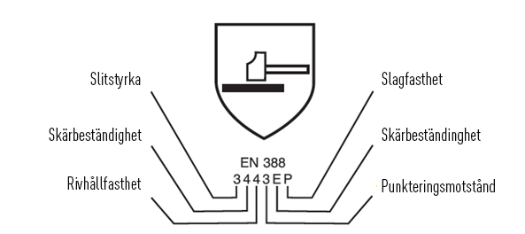 Mekaniska risker - Standarden EN-388:2016 garanterar säkerheten och kvaliteten på produkter och tjänster. Arbetshandskar måste följa dessa standarder och testas för motståndskraft mot slitage, genomskärning (x 2), rivhållfasthet, punkteringsmotstånd och slagstyrka, vilket ger dig möjlighet att bedöma vilka risker handskarna kommer att skydda dig mot - och i vilken utsträckning.