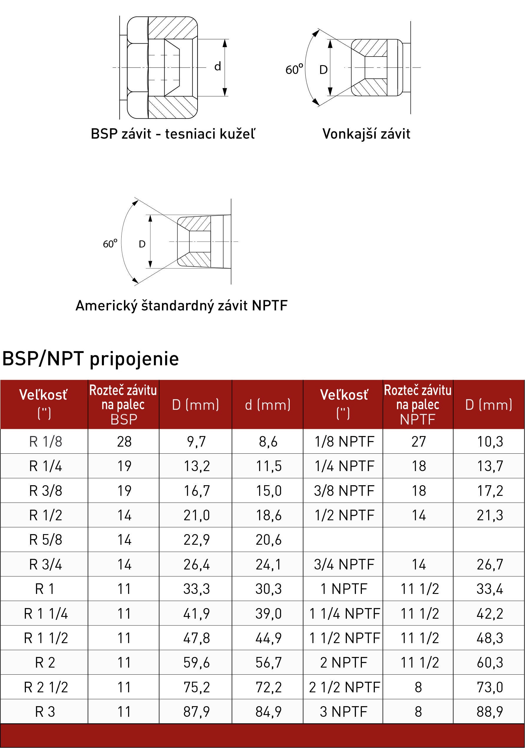 - trubkové (British Standard Pipe – BSPP: valcové alebo BSPT: kužeľové)
