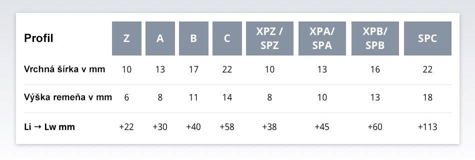 Aby sme vám ukázali, aké sú rôzne veľkosti a rozdiely medzi vnútornou, výpočtovou a vonkajšou dĺžkou rôznych klinových remeňov, pripravili si sme pre vás tabuľku: