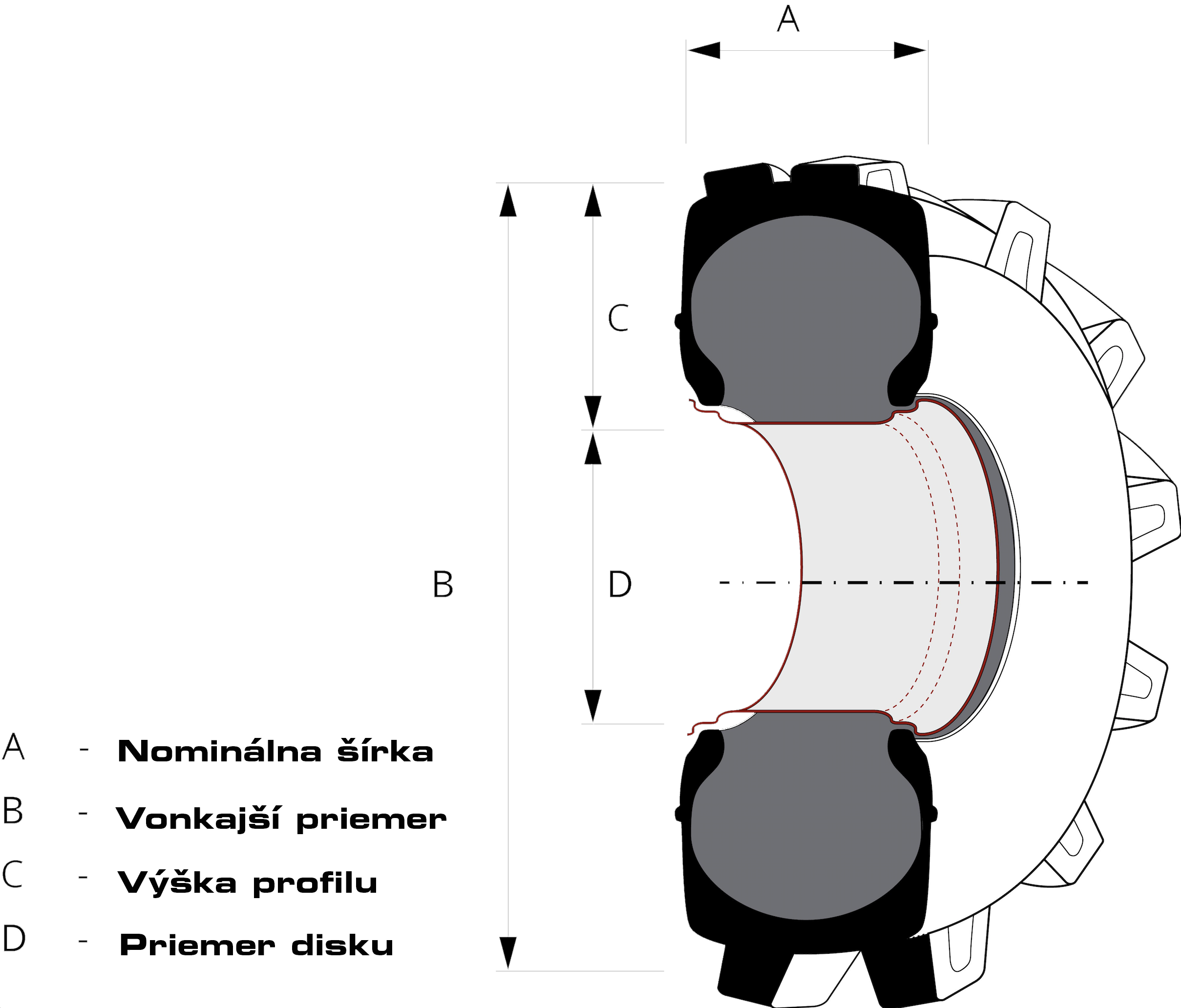 Veľkosť pneumatiky je uvedená v palcoch. Šírka pneumatiky je 12 palcov, čo zodpovedá 305 mm. Priemer disku je 16,5 palcov. Pomlčka označuje, že sa jedná o diagonálnu pneumatiku.