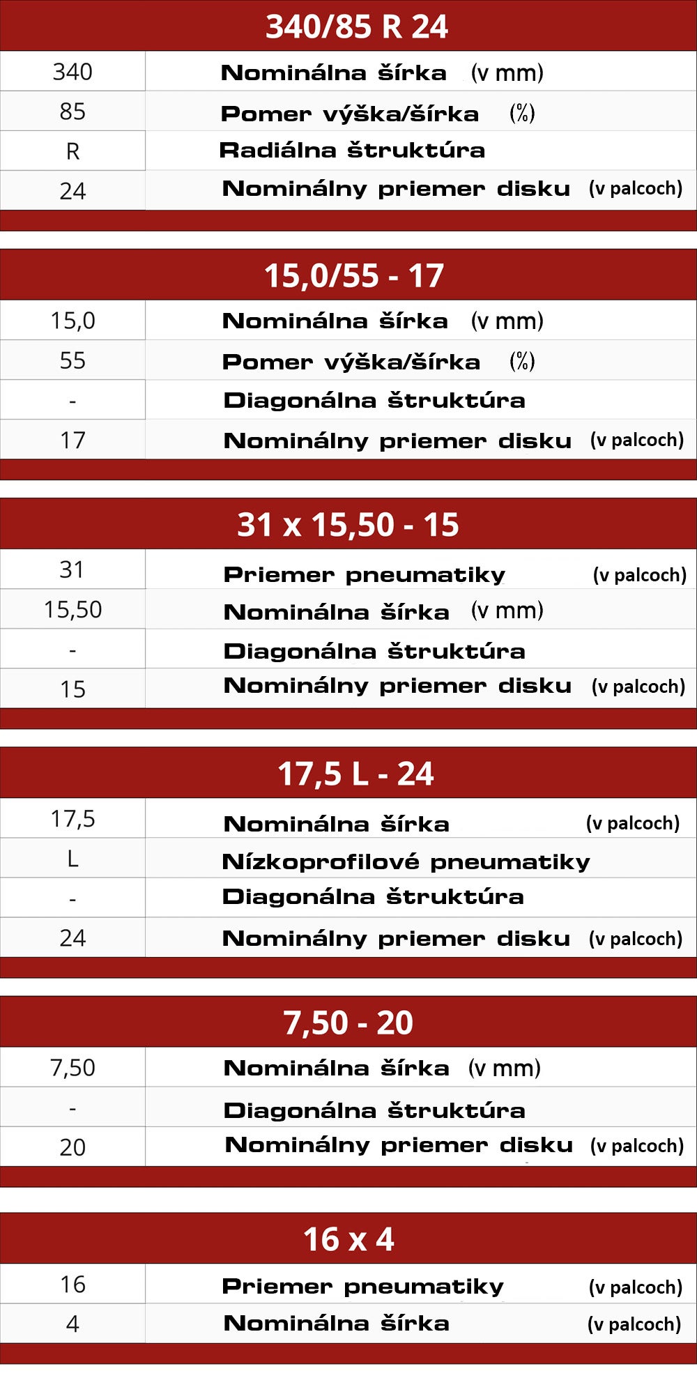 Pri týchto rozmeroch je uvedený iba priemer a šírka pneumatiky. V tomto prípade je priemer 16 palcov = 400 mm a šírka 4 palce = 100 mm.