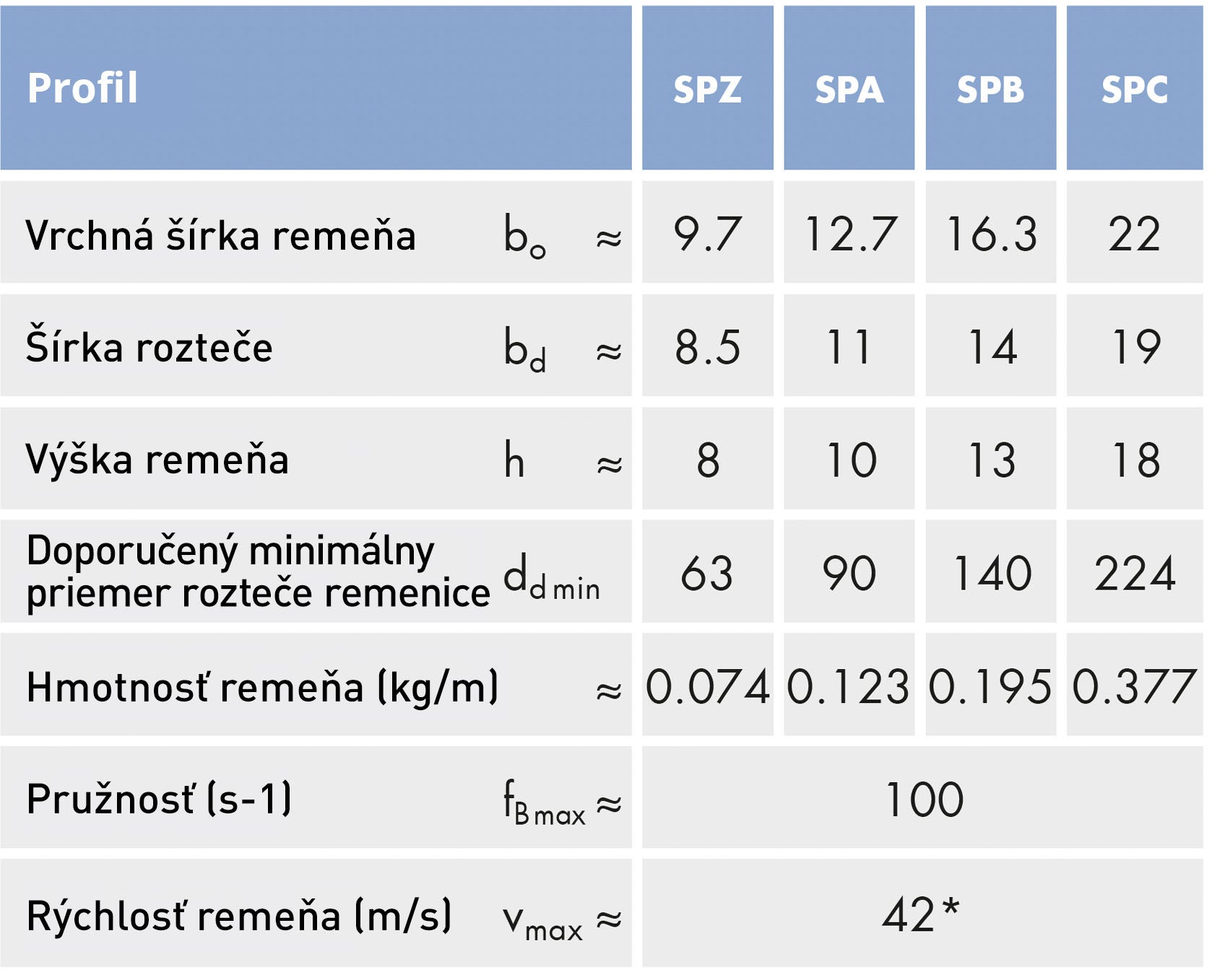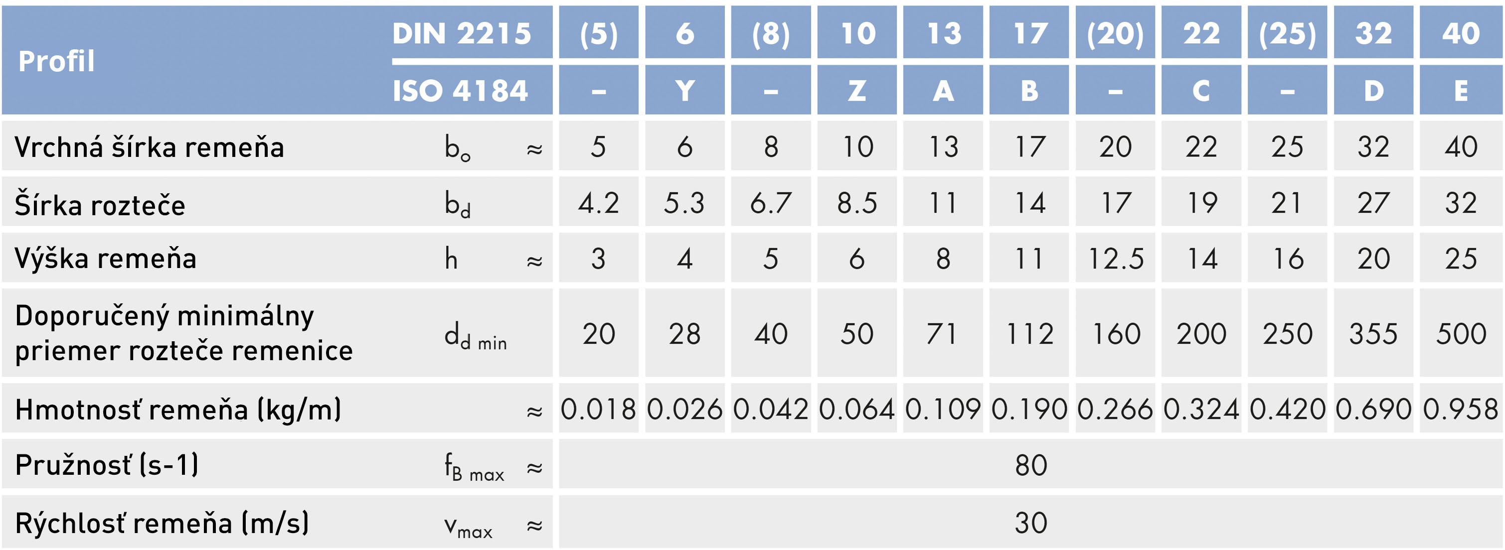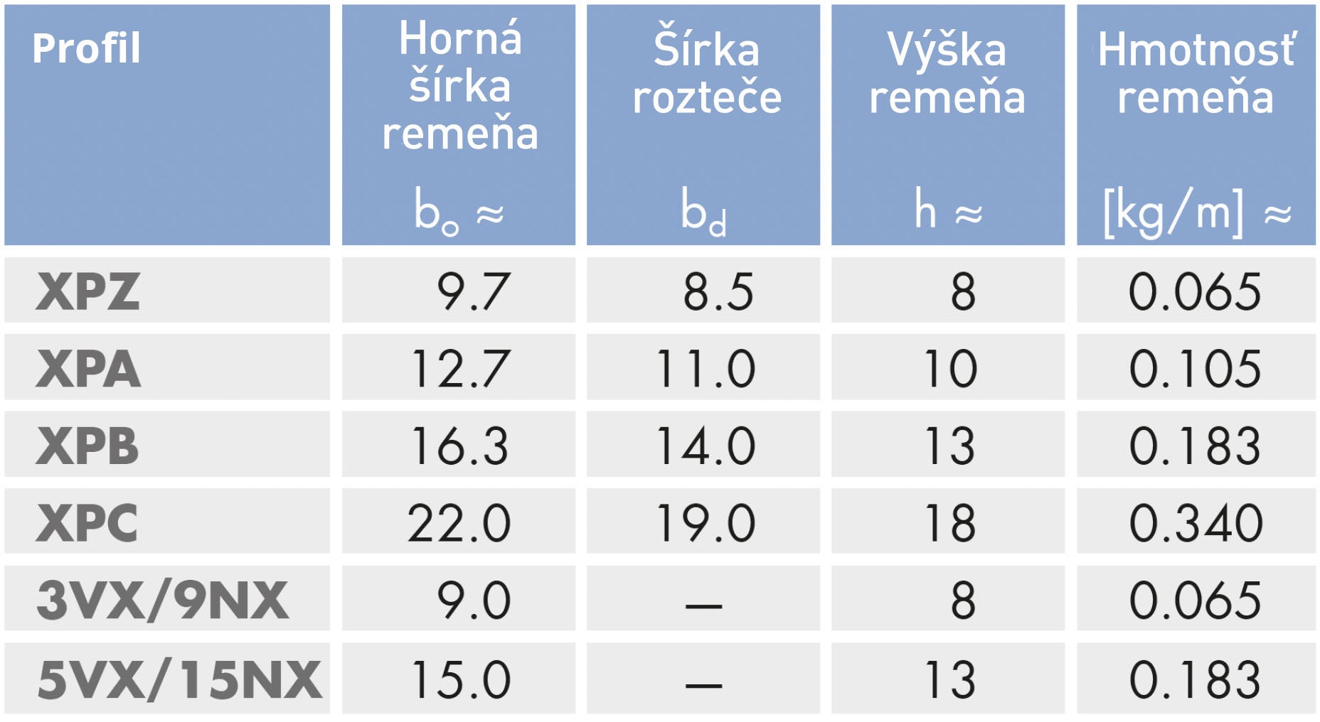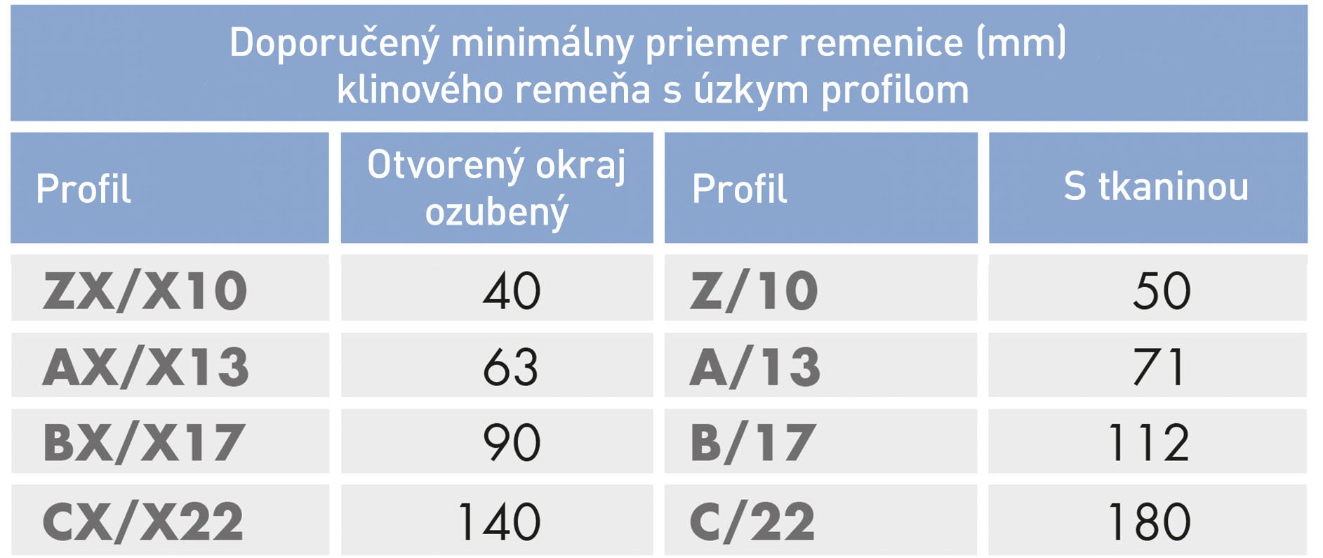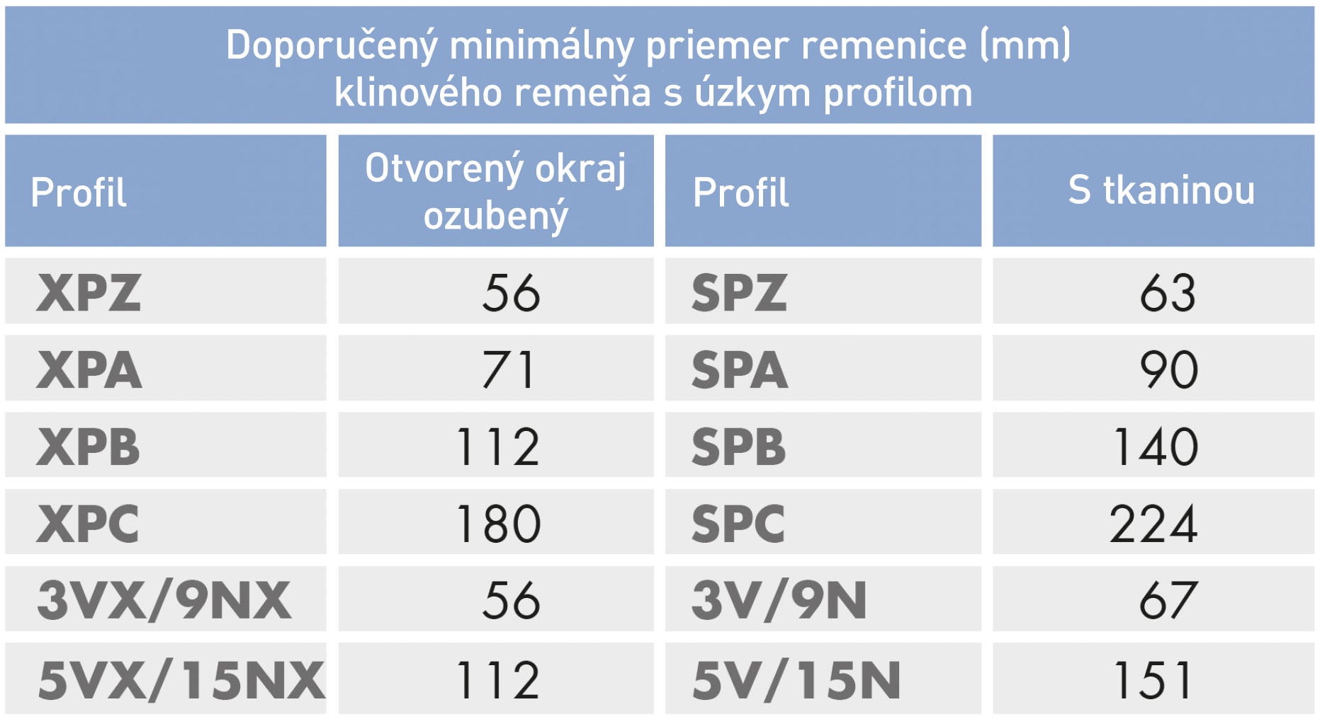 Vhodný klinový remeň s úzkym profilom môžete určiť podľa obrázku a tabuľky nižšie. Prierez je definovaný hornou šírkou a hĺbkou.