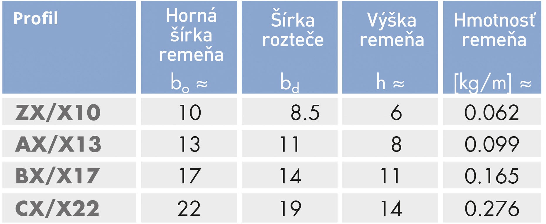 Vhodný klinový remeň môžete určiť podľa obrázku a tabuľky nižšie. Prierez je definovaný hornou šírkou a hĺbkou.
