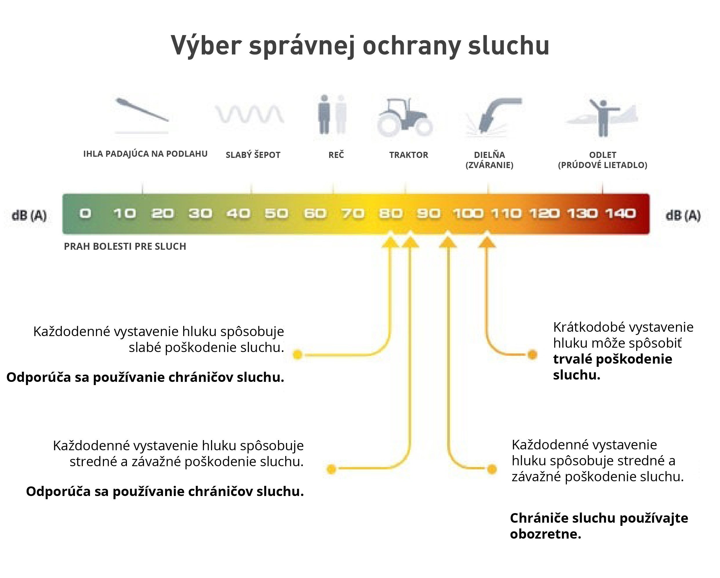 - Hladina hluku: Čím vyššia je hladina hluku, tým väčšie je riziko poškodenia sluchu