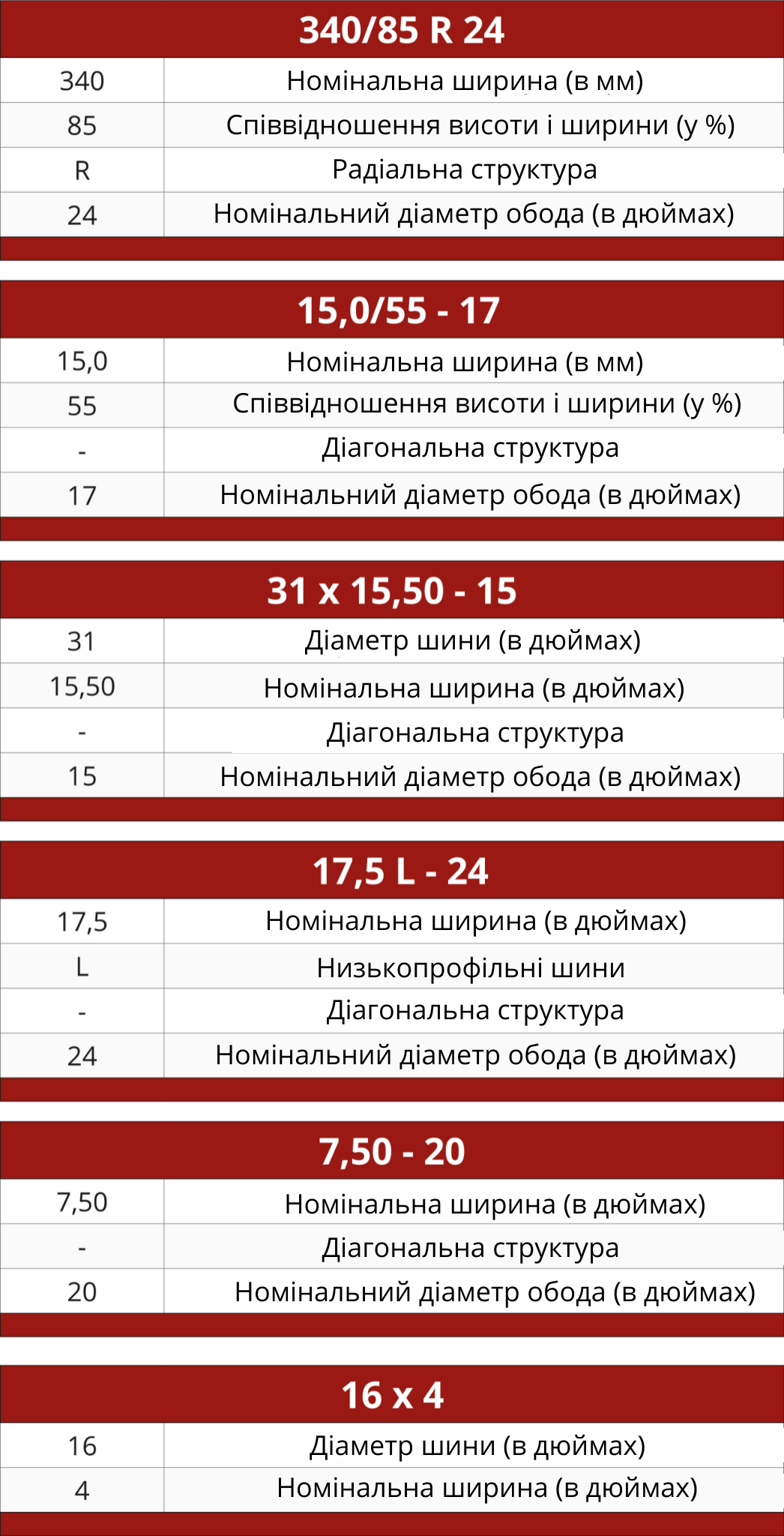 У цих розмірах вказані лише діаметр та ширина шини. В цьому випадку діаметр 16 дюймів = 400 мм, а ширина 4 дюйми = 100 мм.