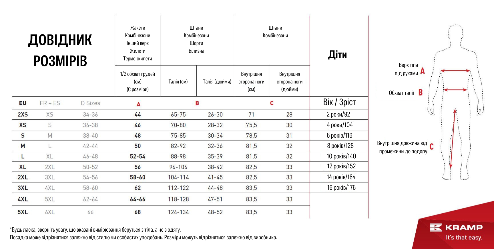 Після вимірювання ви легко знайдете правильний розмір для своїх клієнтів у нашій таблиці розмірів одягу Kramp.